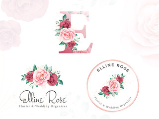 Vector illustration of logo template with monogram element, letter E and floral ornament for restaurant, club, boutique, cafe, hotel cards.