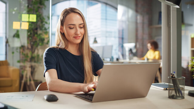 Beautiful Female in a Black Casual Dress Sitting at a Desk in Creative Office, Working on Tasks on Laptop Computer. Young Creative Specialist Writing Corporate Project Plans for Marketing Agenda.