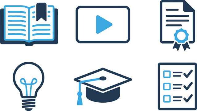 Education learning and academic achievement icons featuring books graduation cap certificates