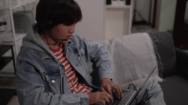 Asian young male student programmer focused on laptop computer for online learning virtual meeting coding from home sofa