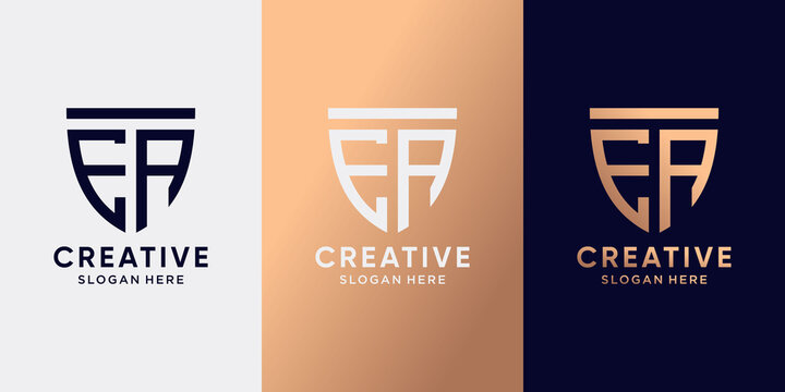 Creative monogram shield logo design initial letter EA with line art style. Logo icon for business company and personal