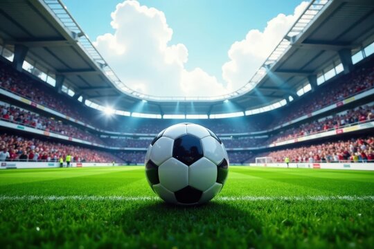 A solitary soccer ball rests on the meticulously manicured field, a majestic stadium filled with eager spectators forming a breathtaking backdrop under a vibrant sunny sky.