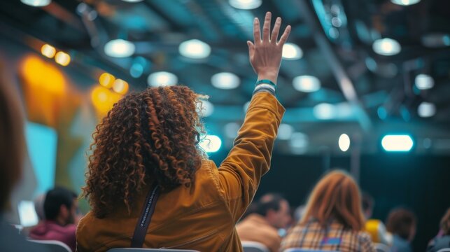 Enthusiastic participants raise their hands, eager to contribute during an inspiring session at the event