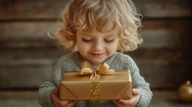 Happy toddler child holding a golden Christmas gift, celebrating holidays, eagerly anticipating unwrapping a special present, sharing joy and festive spirit