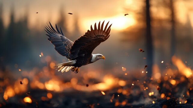 Dramatic image of an eagle navigating through a forest engulfed in flames, showcasing its resilience and aerial agility amidst the fiery turmoil.