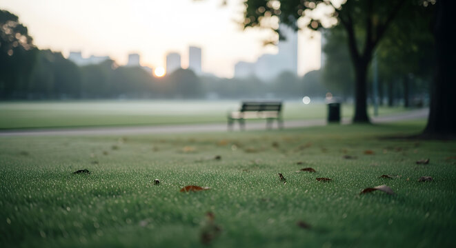 A serene park scene at dawn with dew-kissed grass, fallen leaves, a solitary bench, and distant city skyline bathed in soft morning light.