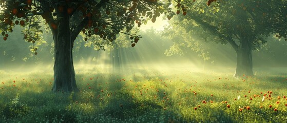 An orchard with low-hanging apples, vibrant green and red colors, and an early morning misty atmosphere