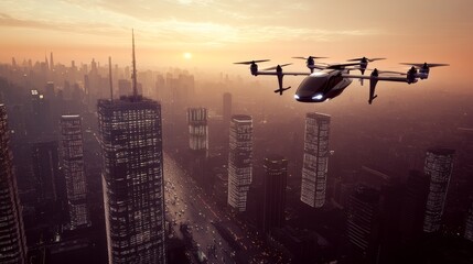 Aerial drone tracking futuristic concept car on urban highway during early morning hours