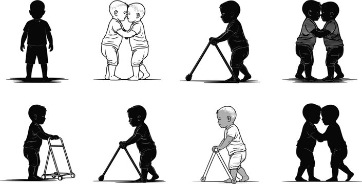 Early childhood development, toddler walker, social interaction, preschool kids, black and white illustration, standing child, affectionate behavior, mobility aid, educational concept, silhouette art