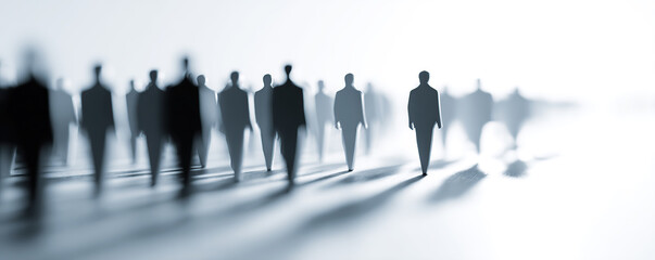 Figures walking towards a light in a foggy urban setting during early morning hours on a busy street