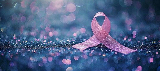 Breast cancer awareness month pink ribbon symbol on blurred blue background with copy space