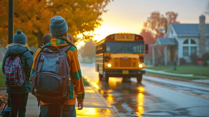 Kids waiting at a bus stop early in the morning, with a yellow school bus approaching in the background