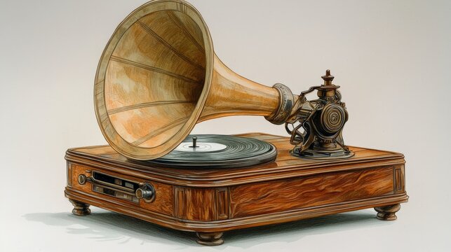 A vintage gramophone with a wooden base and a large horn, showcasing classic craftsmanship and the charm of early music technology.