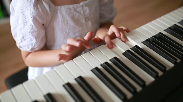 Close-up view of a young girl’s hands playing piano keys at home. Child in a white dress practicing music indoors. Concept of early music education, childhood creativity, and home learning.