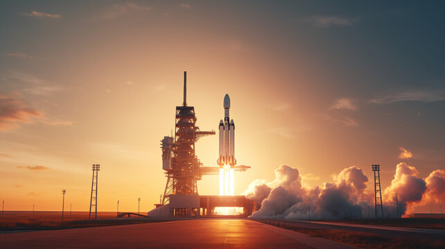 Rocket launches into a colorful sky filled with clouds and stars during an early evening