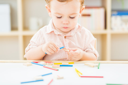Cute little boy (toddler, two years old) is painting on tee. Washable finger paints for Babies Kids, art, creative. Dirty cloth (t-shirt), washing laundry concept.