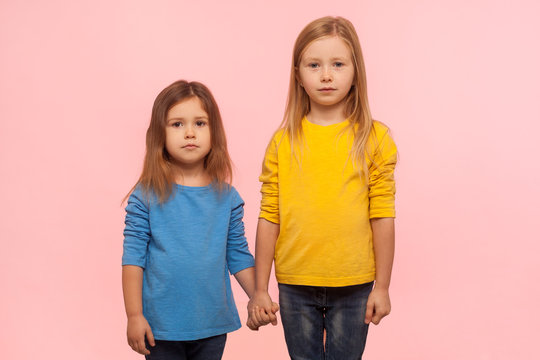 Little friends. Two cute charming preschool girls in sweatshirts standing together, holding hands and looking at camera with serious calm expression. indoor studio shot isolated on pink background