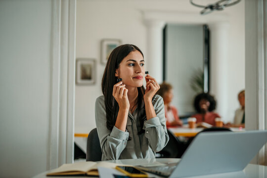 Businesswoman putting on wireless earphones at her desk in the office