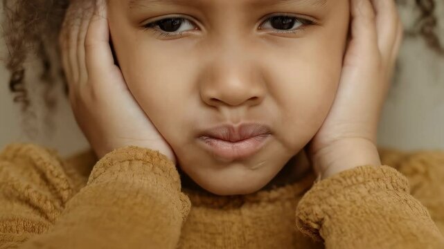 Young boy closes ears with hands. Behavior, attitude concept