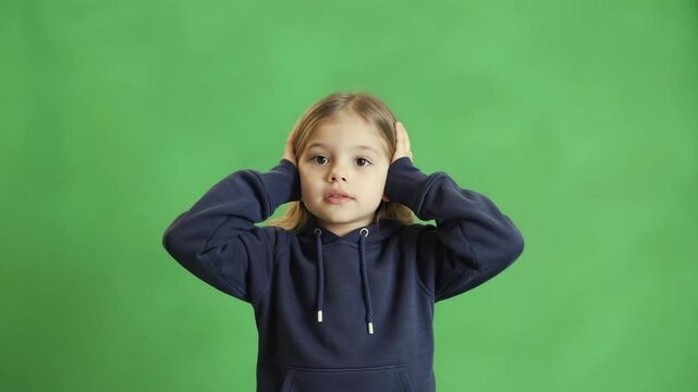 A young girl with blonde hair wearing a navy hoodie covers her ears. The background is a bright green screen, ideal for chroma key effects.
