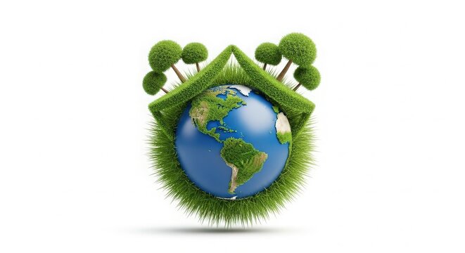 Vibrant green earth with lush foliage and tiny homes globe nature