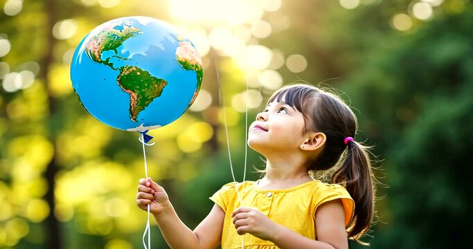 Young girl in yellow dress holding a globe balloon outdoors, surrounded by lush greenery and sunlight