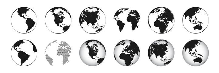 Accurate vector world map, high resolution. Earth globe collection. Black earth globes icons