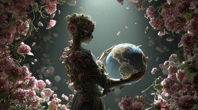 Gaia goddess awakening mother earth in spiritual bloom enchanted floral scene ethereal perspective