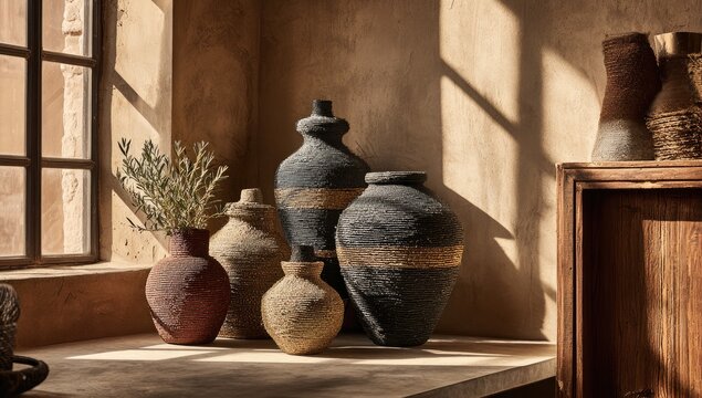 Several handcrafted ceramic vases in warm tones, displayed on a windowsill. Sunlight streams through a window, casting shadows on the beige walls and earthenware