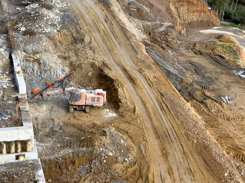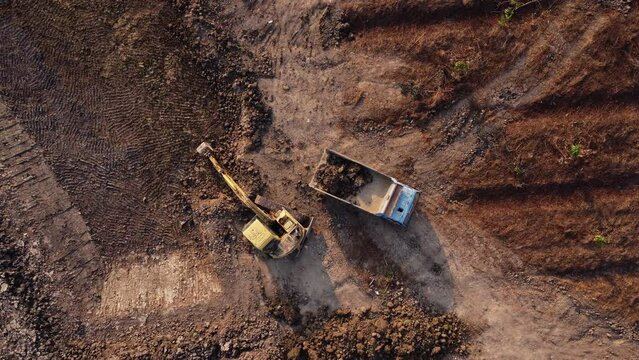 Aerial view of a wheel loader excavator with a backhoe loading sand onto a heavy earthmover at a construction site.