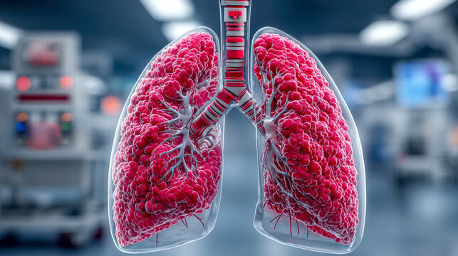 Anatomical model of human lungs with red alveoli and branching bronchi, displayed in a clinical environment