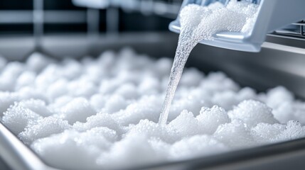 Closeup of a dishwasher's detergent compartment being filled, isolated on a white background, highlighting ease of use and functionality