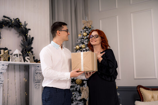 Couple exchanging a present. Couple stands together exchanging present in festive room.