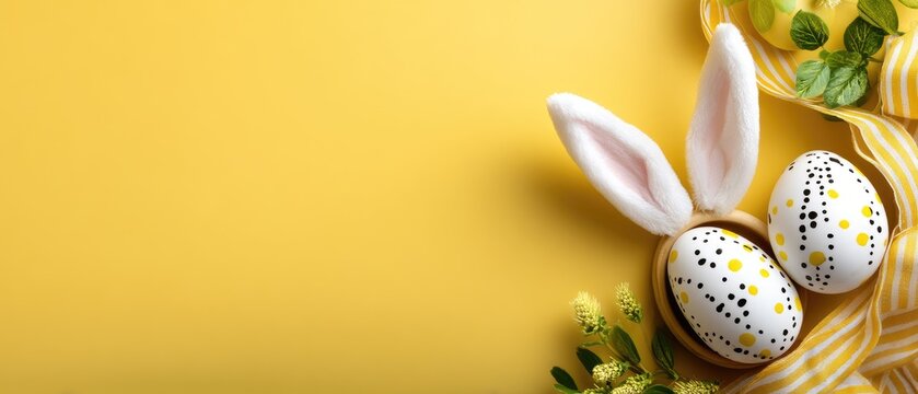Colorful easter eggs with bunny ears on a yellow background create a festive scene for spring celebrations and holiday traditions