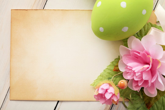 Happy Easter. Congratulatory easter background. Easter eggs and flowers. Background with copy space. Selective focus.