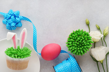 Easter concept with bunny ears cupcakes, blue ribbon, pink egg.