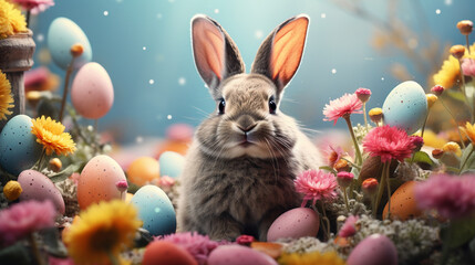 Horizontal AI illustration. Cartoon rabbit with pink and blue Easter eggs. Religions and cultures.