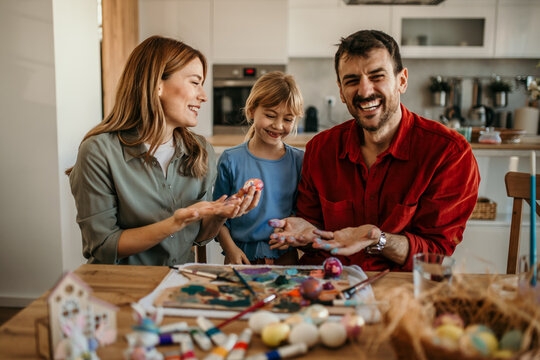 Sweet family portrait of happy mother and little son holding wicker basket full of painted multi colored Easter eggs, embracing and smiling in the cozy light kitchen at home
