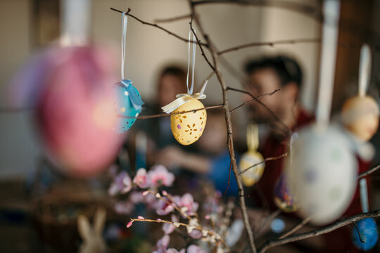 Parents and their little one creating beautiful Easter eggs at the dining room table, focus on a easter three