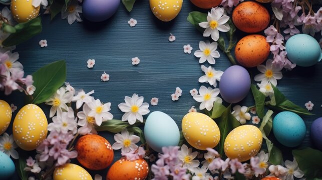 A colorful wreath made from Easter eggs surrounded by flowers, great for spring or Easter-themed images