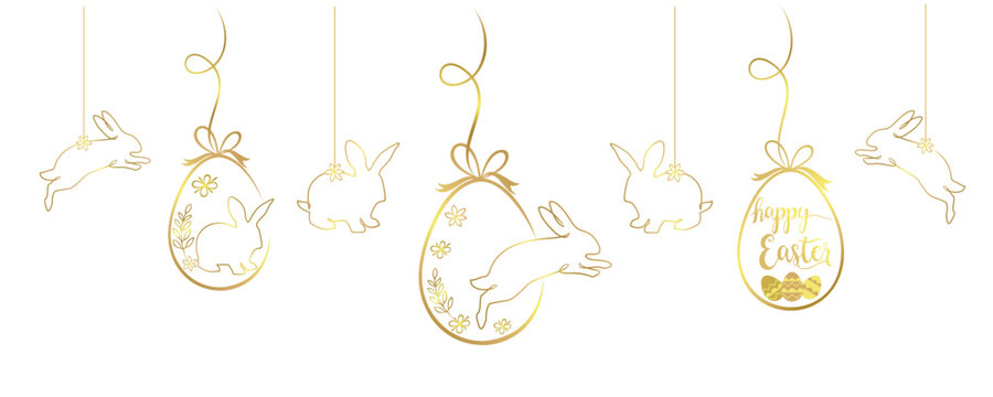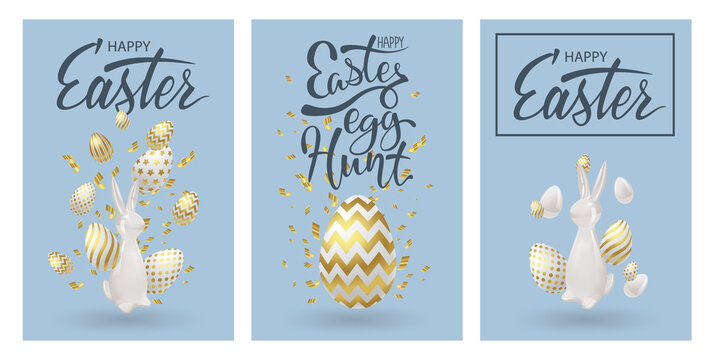 Easter posters or flyers design set with realistic 3d decoration. Golden eggs, ceramic bunny and cold confetti. Happy easter celebrating event cards, egg festival banners. Vector illustration.