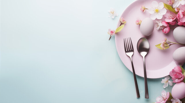 beautiful easter eggs, flowers and plate with cutlery on a pastel background. easter frame layout. place for text. copy space. flat lay. top view