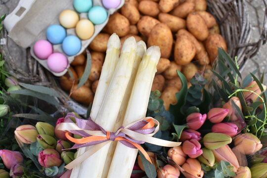 White asparagus with bow, pastel eggs, fresh potatoes and tulips for easter