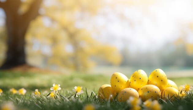 Pastel easter eggs with flowers and grass spring holiday season decoration background image stock photo