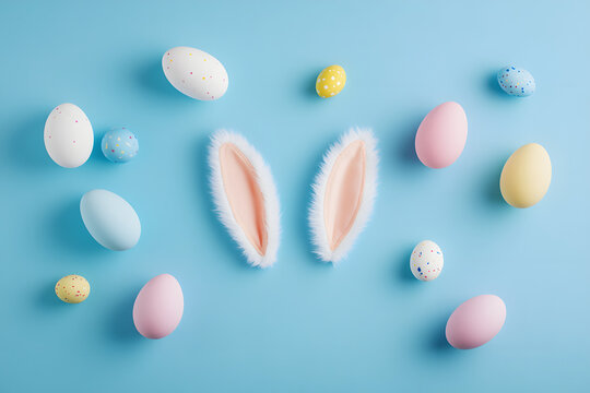 Easter celebration with bright eggs and rabbits under cloudy sky