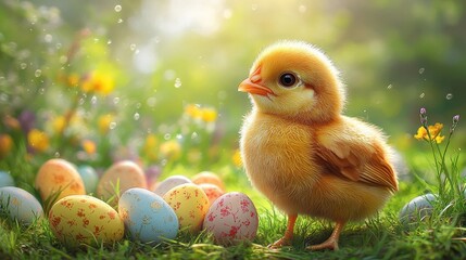 A charming scene shows an adorable bunny among pastel Easter eggs in soft grass, with warm sunlight illuminating the setting, embodying the joyful spirit of the Easter celebration