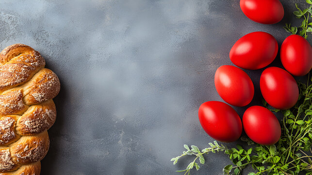 Easter bread, greek tsoureki braid and red easter eggs on table, close up view, copy space