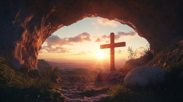 Empty Tomb, Wooden Cross Silhouette Against a Colorful Sunrise Sky Background, Easter Concept