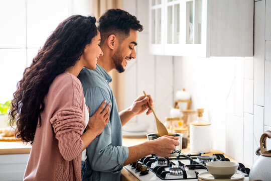 Couple Cooking Together Concept. Young arab spouses preparing dinner in kitchen, handsome middle eastern man stirring meal with spatula while wife embracing him from the back, side view, free space