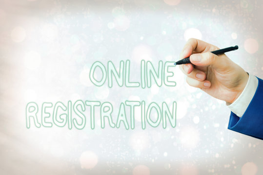 Writing note showing Online Registration. Business concept for Process to Subscribe to Join an event club via Internet